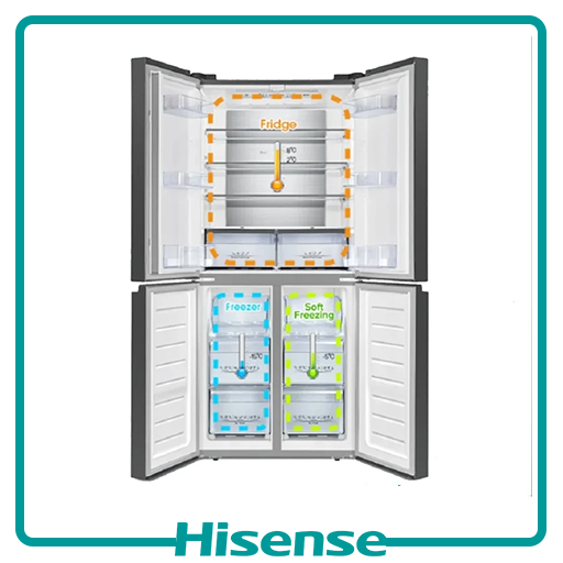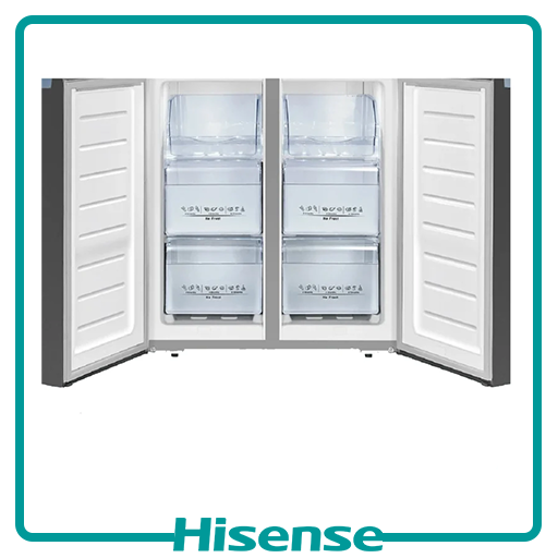 هایسنس برای این مدل طراحی زیبا و حرفهای در نظر گرفته است. بدنه استیل ظاهری مدرن و مقاوم ایجاد میکند. دربهای ساید بای ساید دسترسی به بخشهای یخچال و فریزر را آسان میکند. طبقات داخلی قابلیت تنظیم دارند تا چیدمان بهتر انجام شود. کشوهای مخصوص برای میوه و سبزی تازه ماندن مواد را حفظ میکنند.